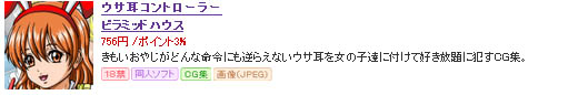 相互リンクサイトのサークル、ピラミッドハウスさんから新作のCG集「うさ耳コントローラー」が発売されたようです。 ちょっと懐かしい感じがする「乱交物」(乱交ものではなかったようで、「絶対服従系」みたいです)ですかね~。 こういうのは作るの大変なんですよね。しかもヒロインが多ければ多いほど面倒なので製作にはかなりご苦労された事と思いますよ~。 |